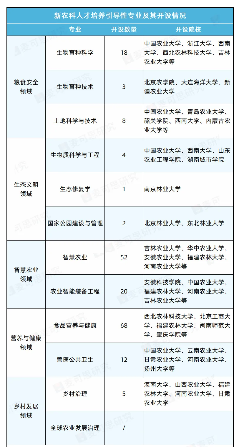 2022年教育部印发《新农科人才培养引导性专业指南》,面向粮食安全、生态文明、智慧农业、营养与健康、乡村发展等五大领域,设置生物育种科学等12个新农科人才培养引导性专业,学位授予门类包含农学、工学、管理学等。